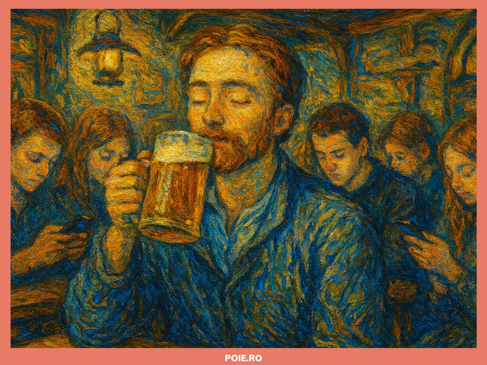 Prietenul meu era din „rezistența tech”. Fusese ultimul care-și luase un mobil. Noi stăteam la masă, cu mâna pe telefon, arătându-ne tot felul de prostii, iar el zâmbea, cu mâna pe berea lui rece. Avea ochii limpezi și calzi. Îl fura din când în când doar televizorul. Era obsedat de muzică, de uitatul pe pereți, cu privirea întredeschisă. Nu ne urmărea neapărat, dar dacă voiai să revii în flow și să lași telefonul, râdea de tine cu poftă, „hah, bine ai revenit, dragule”.