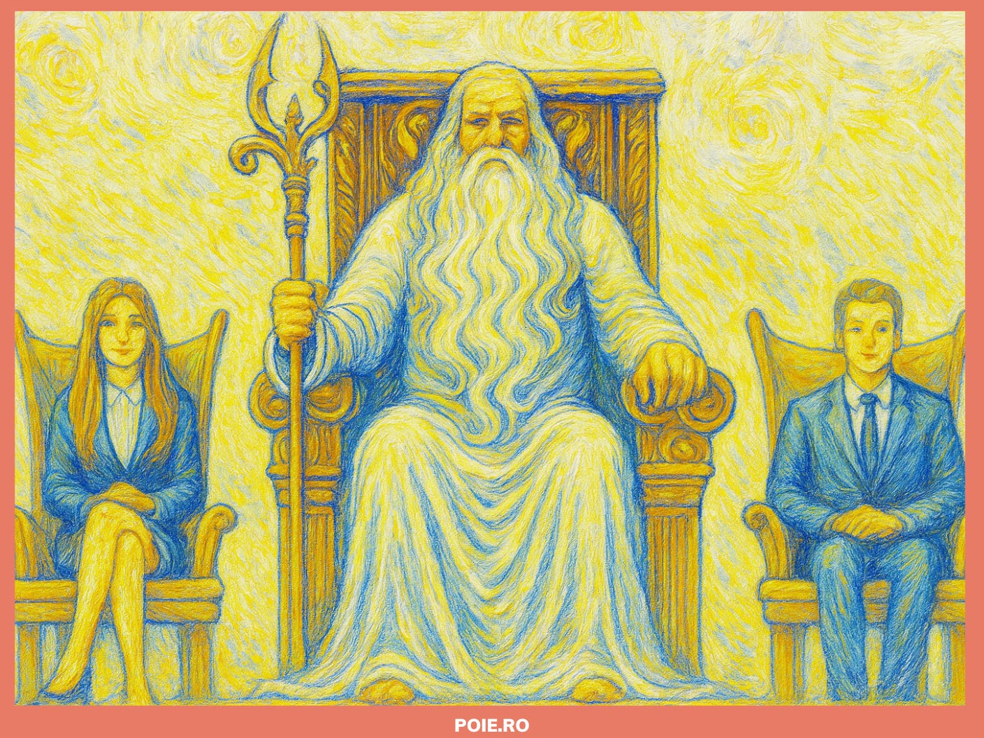 Dumnezeu stătea tolănit pe tronul său din sala de judecată, așteptând să intre cele trei suflete.