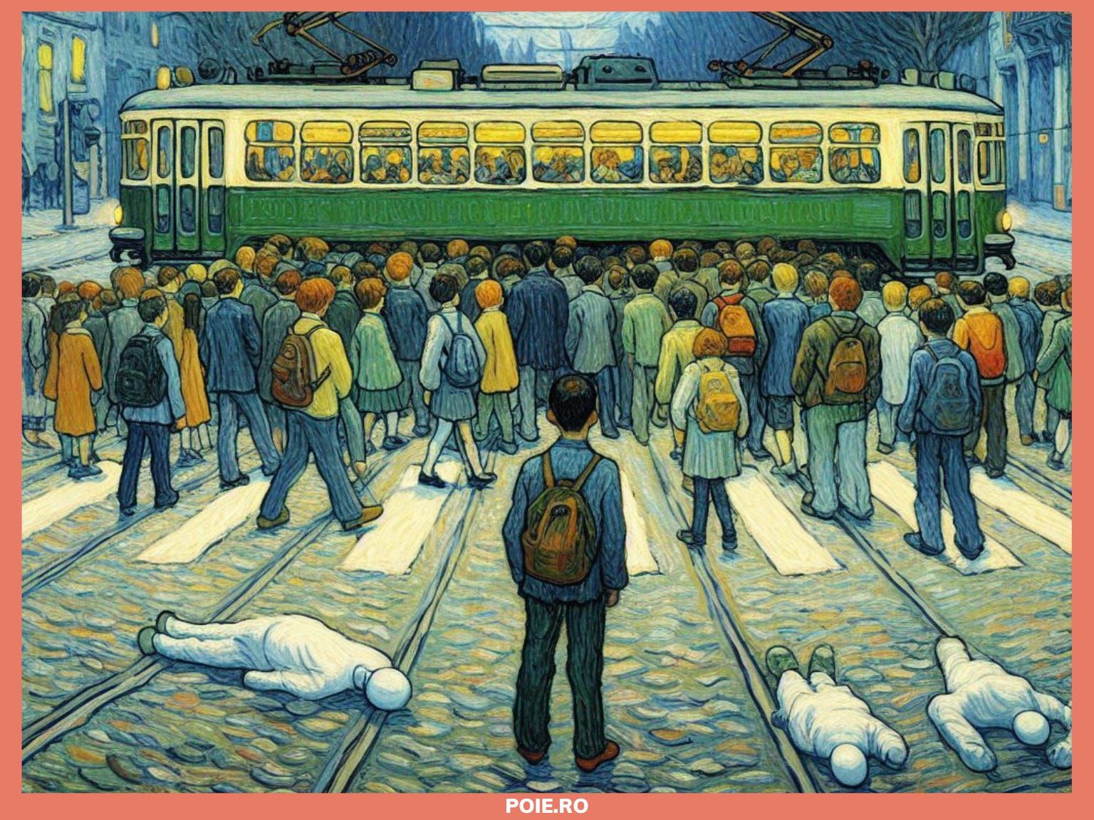 Era primăvară, pe înserate. Eram doar un copil. Mergeam agale spre casă cu S., într-un deceniu lent, printr-un frig prea tăios pentru oasele noastre subțiri. Într-o stație de tramvai lumea se adunase în jurul a ceva. Umbre. Un vatman cu fața-n palme, prăbușit pe o bordură. Plângea. Ne-am apropiat de tramvai.
