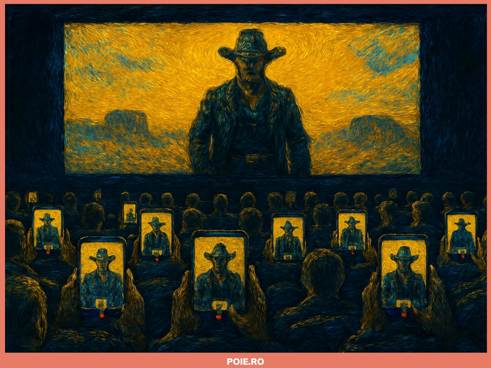 Ieși în hol. Te scuzi printre un soi de stafii cu privirea locked în ecranele înroșite de zeci de mesaje nepreluate. Oamenii nu mai sunt acolo doar pentru film, strict pentru film.